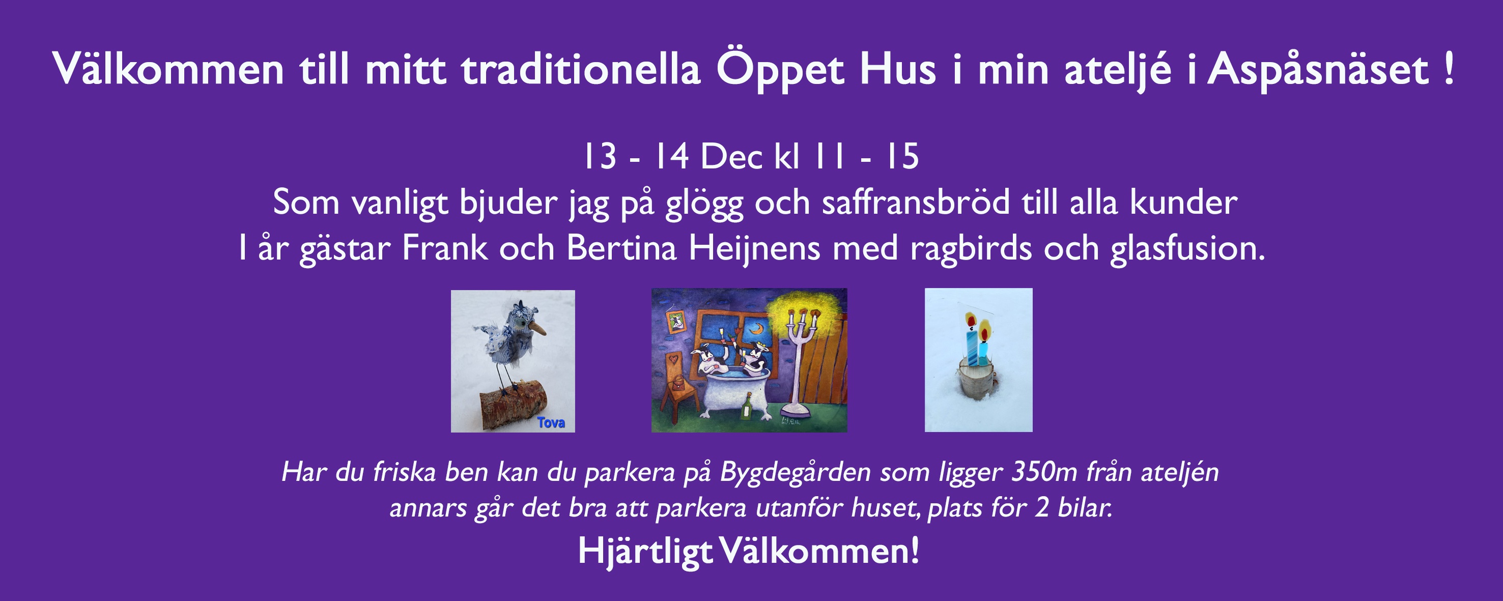 Hösten knackar på dörren och just nu njuter jag av minnena från Stocketittveckan och alla underbara människor som besökte oss. Jag jobbar med beställningar under hösten och kommer att vistas en tid i mitt andra hem i Calcutta. Tredje advent kommer jag att ha öppet hus som vanligt. Då är du hjärtligt välkommen! Vi ses!